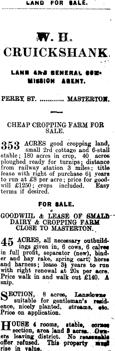 LAND FOR SALE. W. EL CRUICKSHANK LANS AM BENERAk. MISSION AIENT. PERR* ST MASTEBTO*. CHEAP CROPPING FARM FOR SALE. OKO ACRES good cropping land, small 2rd cottage and 6-stall stable; 180 acres in crop, 40 acres ploughed ready for turnips j distance from railway station 3 miles; title lease with right of purchase 6$ years to run at £8 per acre; price for goodwill £1250; crops included. Easy terms if desired. FOR SALE. GOODWIIL & LEASE OF SMALB DAIRY & CROPPING FARM CLOSE TO MASTERTON. 45 ACRES, all necessary outbtuldings given in, 6 cows, 6 calves in full profit, separator (new), binder and nay rake, spring cartj- horse and harness; lease 3} years to ran with right renewal at 20s per sore. Price walk in and walk out £l4O. A snip. QEOTION, 8 acres, L&mtcLowii* suitable for gentleman's residence, nicely planted, streams, eta. Price on application. XTOUSE 4 rooms, stable, wm section, area land 8 acres.. Owmer» leaving district. No r«anuUs offer refused. This property aqß rise in value.