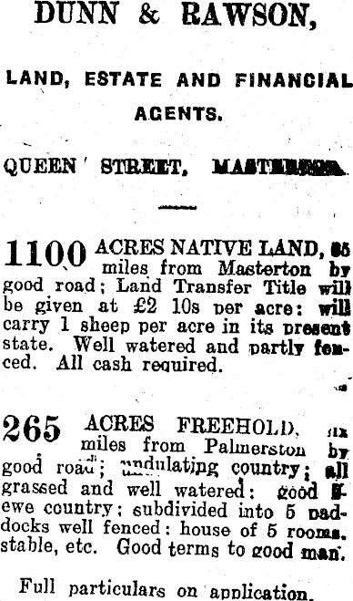 DUNN & RAWSON, LAND, ESTATE AND FINANCIAL AGENTS. QUEEN' SUBSET, UAATMSMKL 1 ] A A ACRES NATIVE LAND, 15 " miles from Maeterton br good road; Land Transfer Title will be given at £2 10s uer acre: Will carry 1 sheep per acre in its present state. Well watered and partly fenced. All cash required. 265 acres freehold; ™ 8 rom by good roau'j »n grassed and well watered: 66 dd it ewe country; subdivided into 5 paddocks well fenced: house of 5 rooms, stable, etc. Good terms to cood mtif, Full particulars on ' application.
