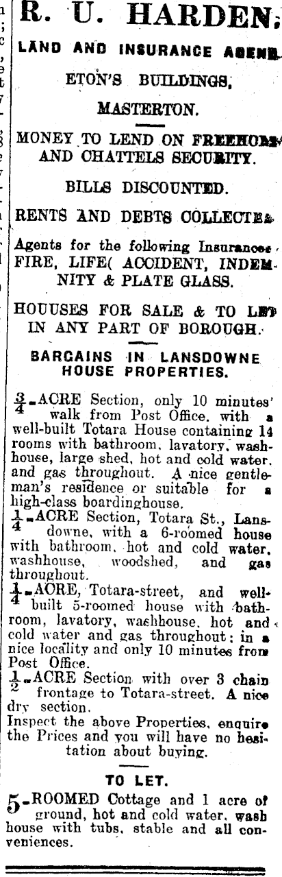 R. U HARDEN; LAND AND INSURANCE ASCNft. ETON'S BUILDINGS, MASTERTON. MONEY TO LEND ON FRKEBOI9P AND CHATTELS SECURITY. BILLS DISCOUNTED. RENTS AND DEBTS COLLECTJS& Agents for the following Insnrano»e» FIRE, LIFE( ACCIDENT, INDEMNITY & PLATE GLASS. HOUUSES FOR SALE & TO LI) IN ANY PART OF BOROUGH. BARGAINS IN LANSDOWNE HOUSE PROPERTIES. £.ACRE Section, only 10 minutes' walk from Post Office, with a well-built Totara House containing 14 rooms with bathroom, lavatory,' washhouse, large shed, hot and cold water, and gas throughout. A -nice gentleman's resißence or suitable for a high-class boardinghouse. -L„ACRE Section, Totara St., Lansdowne, with a 6-ro'omed house with bathroom, hot and cold water, washhouse, woodshed, and gas throughout. X»AORE, Totara-street, and well* 4 built 5-roomed house with bathroom , lavatory, waehhouse. hot and < cold water and gas throughout; in » nice locality and only 10 minutes fron Post Office. ACRE Section with over 3 chain frontage to Totara-street. A nice dry section. Inspect the above Properties, enquire the Prices and you will have no hesi. tation about buying. TO LET. K.ROOMED Cottage and 1 acre of ground, hot and cold water, wash house with tubs, stable and all conveniences.