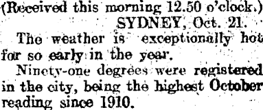 this morning 12.50 o'clock*) ■ / otdney;:OcV'2i:;-. ,-. The weather is" exceptionally hot for so eariyiin "the year. Ninety-one degree*;were registered in the city, being the highest October reading since 1910. ;