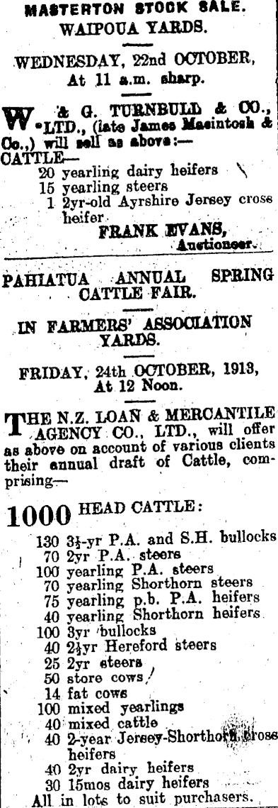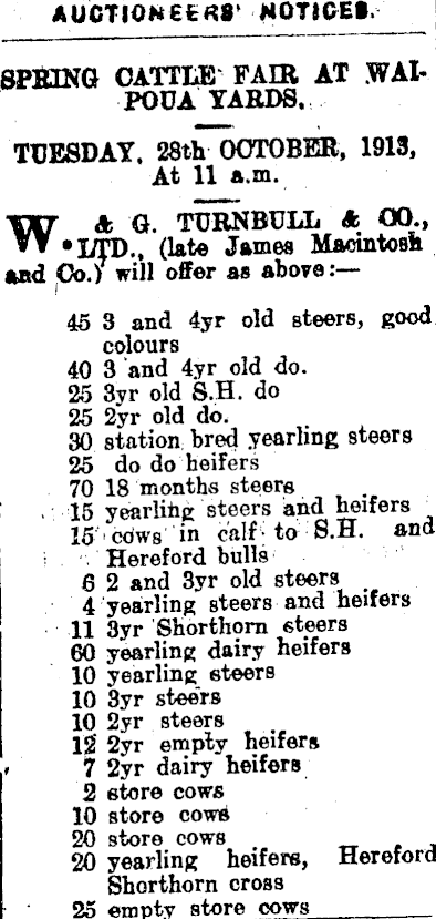 AUCTIOH6fc«B' NOTICE* SPRING CATTIE FAIR AT WAIPOUA YARDS. TUESDAY. 28th OCTOBER, 1913, At 11 A.m. ft G. TTJRNBULL A 00., •I/TD., (late James MaointoßH and Co.) will offer as abo?e : 45 3 and 4yr old steers, good colours 40 3 and 4yr old do. 25 Syr old S.H. do 25 2yr old do. 30 station; bred yearling steers 25 do do heifers 70 18 months steers 15 yearling steers and heifers _ 15 < cdws in calf •to S.H. and Hereford bulls 6 2 and 3yr old steers 4 yearling steers and heifers 11 3yr Shorthorn steers 60 yearling dairy heifers 10 yearling steers 10 Syr steers 10 2yr steers 12 2yr empty heifers » 7 2yr dairy heifers 2 store cows 10 store cows 20 store cows 20 yearling heifers, Hereford Shorthorn cross 25 empty store cows