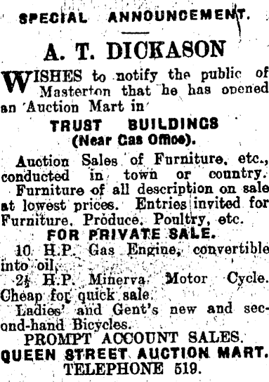 SPECIAL ANNOUNOEMEI A T. DIOFASON jTISHES to notify the public of * Masterton that he has oneried an 'Auction Mart in' TRUST BUILDINCB (Near Cu OfflM). Auction'-''Sales of Furniture, etc., conducted in- town or country. Furniture of all description on sale at lowest prices. Entries invited for, Furniture, Produce; Poultry, etc. FOR PRIVATE SALE. 10 iGas.EnEme* convertible, tnto^^Hf^y- '.' *.-' ;''■. ".- *2si#:w'-,,M?tyrr%r'Motor ; : CVcl©. Cheap iot'qufck'sale;:', l Eadies? and Gent's new and sec-ond-hand Bicycles. . PROMPT ACCOUNT SALES. QUEEN STREET AUCTION MART. TELEPHONE 619.