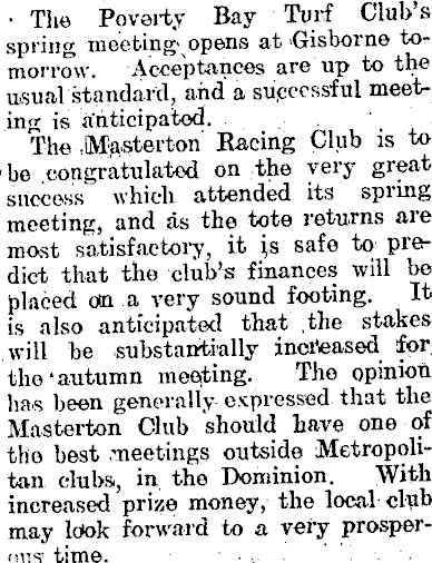 ■ The Poverty Bay Turf Club's spring meeting- opens at iGisborne tomorrow. Acceptances are up to the usual'standard, and a successful meetin"- is anticipated. The Masterton Racing Club is to be congratulated on the very great success which attended its spring meeting, and as the tote returns are most satisfactory, it \s safe to predict that the club's finances will be placed om a very sound footing. It is also anticipated that ,the stakes will be substantially increased for. the-autumn meeting. The opinion has been generally expressed that the Masterton Club "should have one of the best .meetings outside Metropolitan clubs, in the Dominion. With increased prize money, the local club may took forward to a very prosperous 1 time. '•■.■• "'.■-■.