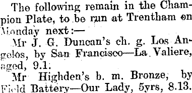 The following remain in the Champion Plate, to be ran at Trentham en Monday next: — .Mr J. G. Duncan's eh. g. Los _Angelas, by San Francisco —La.Valiere, aged, 9.1. "Mr Highden's b. m. Bronze, by F!<-1d Battery—Our Lady, syrs, 8.13.