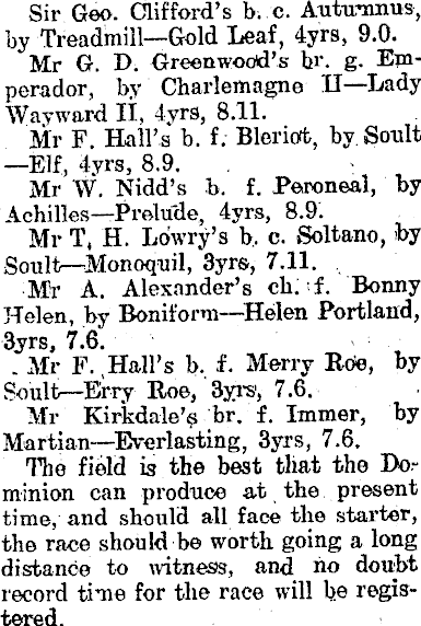 Sir Geo. Clifford's b. c. Autuiinus, by Treadmill—Gold Leaf, 4yrs, 9.0. Mr G. D. Greenwood's br. g. Emperador, by Charlemagne ll—Lady Wayward 11, 4yrs, 8.11. Mr F. Hall's b. f. Bleriot, by Soult —Elf, 4yrs, 8.9. Mr W. Nidd's b. f. Peroneal, by Achilles—Prelude, 4yrs, 8.9. Mr T, H. Lowry's b, c. Soltano, by Soult—Monoquil, 3yrs, 7.11. . Mr A. Alexander's ch;;f. Bonny Helen, by Boniform—Helen Portland, 3yrs, 7.6. < •• ~ . Mr F. .Hall's b. f. Merry Roe, by Roe, '3yrs, 7.6. Mr Kirkdaleybr. f. Immer, by Martian—Everlasting, 3yrs, 7.6. The field is the best that the Dominion can produce at the present time, and should all face the starter, the race should be worth going a long distance to witness, and no doubt record time for the race will be registered.