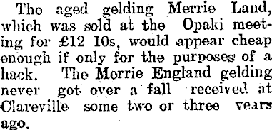 The aged gelding Merrie Land,' which was sold at the Opaki meeting for £l2 10s, would appear cheap enough if only for the purposes' of a hack. The Merrie England gelding never got over a fall received at Clareville some two or three vears ago.