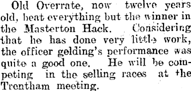 Old Overrate, now twelve years old, beat everything but the ninner in the Masterton Hack. Considering that he has done very littl-3 work, the officer gelding's performance was quite a good one. He will be competing in the selling races at +he Trontham meeting.