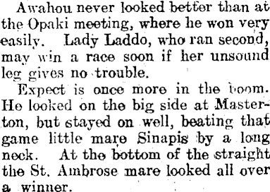 Awahou never looked better than at the Opaki meeting, where he won very easily. Lady Laddo, who ran second, may win a race soon if her unsound leg gives no trouble. Expect is once more in the boom. He looked on the big side at Masterton, but stayed on well, beating that game little mare Sinapig by a long neck. At the bottom of the straight the St. Ambrose mare looked all over a winner.