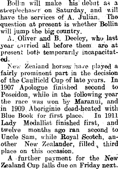 Bf>!):n will make his'debut a steeplechaser on Saturday, and will have the services of A. Julian. The question at present is whether Bollin will jump the big country. A. Oliver and B. Deeley, why last year carried all before them are at present both temporarily incapacitated. , >"ew Zealand horses' ha/e played a fairly prominent part in the decision of the Caulf ield Oup of late years. In 1907 Apologue finished second to Poseidon, -while in the following year the race was won l>y Maranui, and in 1909, Aboriginie dead-heated with Blue Book far first place. In 1911 Lady Medallist finished first, and twelve months ago ran second to Uncle Sam, while Royal Scotch, another New Zealander, filled, third place on this occasion. A -further payment for the New Zealand Oup falls due on Friday next.