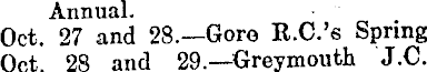 Annual. Oct. 27 and 28.—Goro R.C.'s Spring Oct. 28 and 29.—Greymouth J.C.