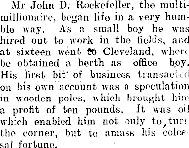 Mr John D. Rockefeller, the multimillionaire, began life in a very humble way. As a small boy he was hired out to work in the fields, and at sixteen went fib Cleveland, whore be obtained a berth as office boy. His first bit' of business transacted on his own account was a speculation in wooden poles, which brought him a profit of ten pounds. It was oil which enabled him not only to, tun the corner, but to amass his colessal fortune.