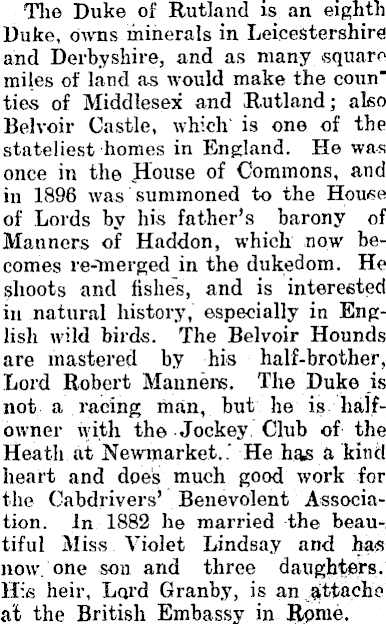 The Duke of Rutland is an eighth Duke, owns minerals in Leicestershire and Derbyshire, and as many, square miles of land as would make the coun' ties of Middlesex and Rutland; also Belvoir Castle, which' is one of the stateliest homes in England. He was once in the House of Commons, andin 1896 was" summoned to the House of Lords by his father's barony of Manners of Haddon, which now becomes re-Tmerged in the dukedom. He shoots and fishes, and is interested in natural history, especially in English wild birds. The Belvoir Hounds are mastered by his half-brother, Lord Robert Manners. The Duke is not a racing man, but he is halfowner with the Jockey, Club of the Heath at Newmarket..' He has a kind heart and does much good work for the Cabdrivers' Benevolent Association. In 1882 he married the beau- i: tiful Miss Violet Lindsay and ha<s' now. one son and three daughters. H:s heir, Lqrd Granby, is an attache at the British Embassy in Rome.