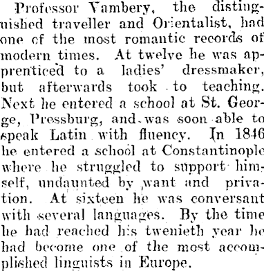 Professor Yambery, the distinguished traveller and Orientalist, had one of the most romantic records of modern times. At twelve he was apprenticecl to a ladies' dressmaker, but afterwards took •to teaching. Next lie entered a school at St. George, Pressburg, and-was soon able to speak Latin with fluency. Jn 1846 he entered a school at Constantinople where lie struggled to sirpport himself, undaunted by ,want and privation. At sixteen he was conversant with several languages. By the time he had readied his twenieth year lie had become one of the most accomplished linguists in Europe.