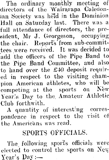 The ordinary monthly meeting of directors of the Caledonian Society was held in the Dominion Hall on Saturday last. There was a full attendance of directors, the president, Mr J. Georgeson, occupying the chair. RepprFsfrom sub-commit-tees were received. It was decided to add the officers of the Pipe Band to the Pipe Band Committee, and also to hand over the £4<l deposit required in respect to the visiting champion American athletes, who will be competing at the .sports An New Year's Day to the. Amateur Athletic Club forthwith. A quantity of interesting correspondence in respect to the visit of the Americans was read. SPORTS OFFICIALS. The following sports officials were elected to control the sports on Xe\y Year's Pay