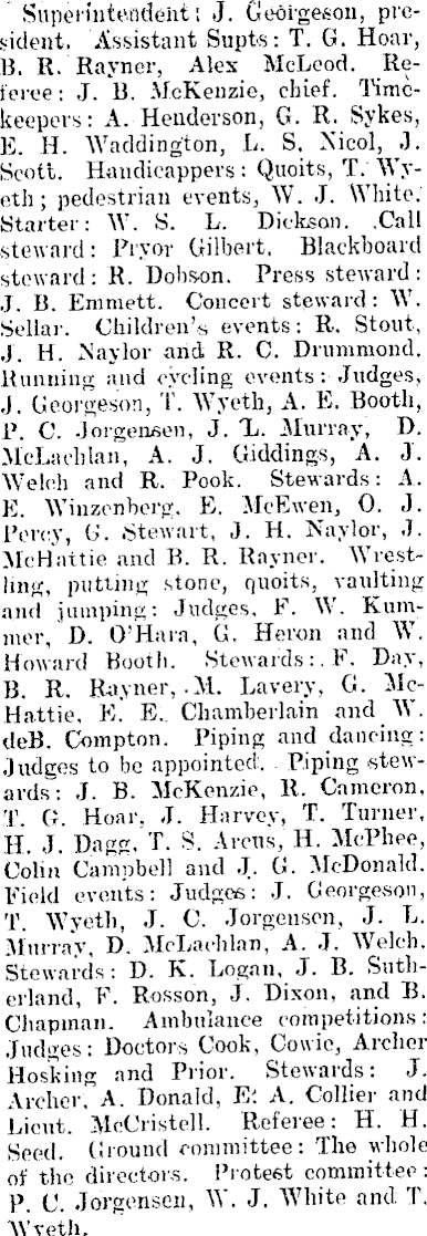 Superintendent; J. Georgeson, president. Assistant Supts: T. G. Hoar, 13. R. Rayner, Alex McLeod. Referee: J. B. McKenzie, chief. Timekeepers: A. Henderson, G. R. Sykes, E. H. Waddington, L. S. Nicol, J. Scott. Handicappers : Quoits, TV Wy- j eth; pedestrian events, W. J. White. Starter: W. S. L. Dickson. .Call steward : Pryor Gilbert. Blackboard steward: R. Dobs-on. Press steward: J. B. Emmett. Conceit steward: W. Sellar. Children's events: R. Stout, J. H. Nay lor and R. C. Drummond. Running and cycling events: Judges, J. Georgeson, T. Wyeth, A. E, Booth, P. C. Jorgensen, J. X. Murray, D. McLachlan, A. J. Giddings, A. J. Welch and R-. Pook. Stewards: A. E. Winzenberg. E. McEwen, 0. J. Percy, G. Stewart, J. H. Naylor, J. McHattie and B. R. Rayner. Wrestling, putting stone, quoits, vaulting and jumping: Judges, F. W. Kummer, D. O'Hara, G. Heron and W. Howard Booth. Stewards:. F. Day, B. R. Rayner, .M. Lavery, G. McHattie, E. E.. Chamberlain and W. deß. Compton. Piping and dancing: Judges to be appointed:. Piping stewards: J. B. McKenzie, R. Cameron, T. G. Hoar, J. Harvey, T. Turner, H. J. Dagg, T. S. A reus, H. McPhee, Colin Campbell and J. G. McDonald. Field events: Judges: J. Georgeson, T. Wyeth, J. C. Jorgensen, J. L. Murray, D. McLachlan, A. J. Welch. Stewards: D. K. Logan, J. B. Sutherland, F. Rosson, J. Dixon, and B. Chapman. Ambulance competitions: Judges: Doctors Cook, Cowie, Archer Hosking and Prior. Stewards: J. Archer"A. Donald, E'. A. Collier and Lieut. McCristell. Referee: H. H. Seed. Ground committee: The whole of the directors. Protest committee: P. C. Jorgensen, W. J. White and T. Wyeth.