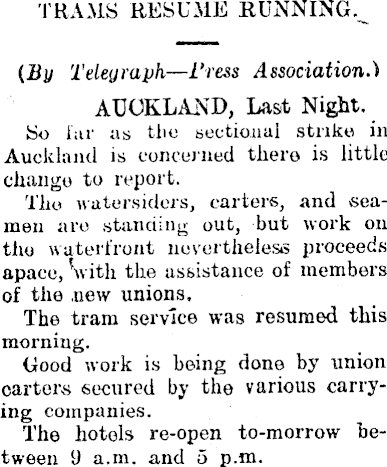 TRAMS RESUME RUNNING.^ {By Telegraph — i'ress Association.) AUCKLAND, Last Night. So far as the sectional strike in Auckland is concerned there is little change to report. Tho watersiders, carters, and seamen are standing out, but work on tho waterfront nevertheless proceeds apace, Svith the assistance of members of the new unions. The tram service was resumed this morning. Good work is being done by union carters secured by the various carrying companies. The hotels re-open to-morrow between 9 a.m. and 5 p.m.