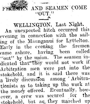 vmBKK' AND SEAMEN'COME "OUT." WELLINGTON, Last Night. An unexpected hitch occurred this evening in connection with the sailing of the Maunganui for Lyttelton. Early in the evening the firemen came ashore, having been called "out" by the union. The seamen indicated that-fKey would not work if Arbitration men were put into the stokehold, and it is said there was a lively discussion among ' Arbitra-t,ionis-t.s as to taking tip the work at the money offered. Eventually, however, a crew was .secured for. the stokehold, but a<& tliey marched up