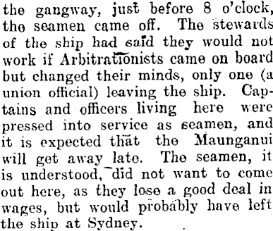 the gangway, just before 8 o'clock, the seamen came off. The stewards of the ship had said they would not work it" Arbitraftonists came on board but changed their minds, only one (a union official) leaving the ship. Captains and officers living here were pressed into service as eeamen, and it is expected that the Maunganui will get awayjate. The seamen, it is understood, did not want to come out here, as they lose a good deal in wages, but would probably have left the ship at Sydney.