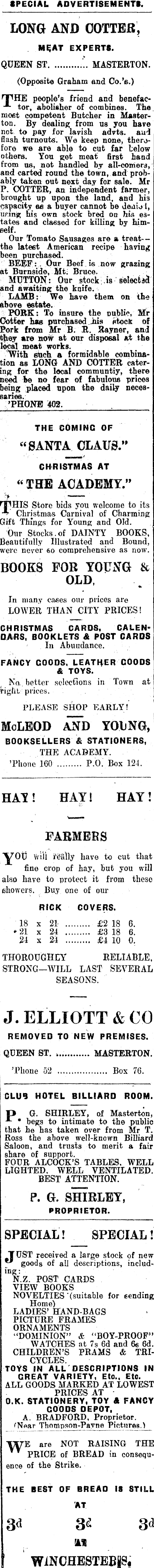 SPECIAL ADVERTISEMENTS. LONG AND COTTER, ME|AT EXPERTS. QUEEN ST 1 MASTERTON. (Opposite Graham and Co.'e.) rpHE people's friend and benefactor, abolisher of combines. The most competent Butcher in Masterton. By dealing from us you have not. to pay for lavish advts. aai flash turnouts. We keep none, thenn fore we are able to cut far Lelow others. You get meat first hand from us, not handled by all-comers, and carted round the town, and probably taken out next day for sale. Mr P. COTTER, an independent farmer, brought up upon the land, and his capacity ae a buyer cannot be denia l, uning his own stock bred on his estates and classed for killing by himself. Our Tomato Sausages are a treat--the latest American recipe having been purchased. BEEF : . Our Beef Js now grazing at Burnside, Hit; Bruce. MUTTON: Our stock .is selectai and awaiting the knife. ' LAMB: We have them on the PORK: To insure the cublio, Mr (Totter has purchased iiis stock of Pork from Mr B. R. Rayner, and ttey are now at our disposal At the local meat works. '"With such a formidable combination as LONG AND COTTER catering for the local communtiy, there need be no fear of fabulous prices being placed upon the daily necessaries. 'PHONE 402. THE COMING OF "SANTA GLAUS." CHRISTMAS AT " THE ACADEMY." fpHIS Store bids you welcome to its Christmas Carnival of Charming Gift Things for Young and Old. Our Stocks.of DAINTY BOOKS, Beautifully Illustrated and Bound, were never 60 comprehensive as now. BOOKS FOB YOUNG & OLD, In many cases our prices are LOWER THAN CITY PRICES! CHRISTMAS CARDS. CALENDARS, BOOKLETS & POST CARDS In Abundance. FANCY GOODS, LEATHER GOODS & TOYS. No., better selections in Town at Tigiit prices. PLEASE SHOP EARLY! McLEOD AND YOLNG, BOOKSELLERS & STATIONERS, THE ACADEMY. 'Phone 160 P.O. Box 124. HAY! HAY! HAY! FARMERS Y °u will i'6'ttlly have to cut that fine crop of hay, but you will also have to protect it from these ehowers. Buy one of our RICK COVERS. 18 x 21 £2 18 6. *2l x 24 £3 18 6. 24 x 24 £4 10 0. THOROUGHLY RELIABLE, STRONG-WILL LAST SEVERAL SEASONS. J. ELLIOTT & CO REMOVED TO NEW PREMISES. QUEEN ST. MASTERTON. 'Plione 52 Box 76. CLUB HOTEL BILLIARD ROOM. 13 G. SHIRLEY, of Masterton, * begs to intimate to the public that he has taken over from Mr T. Ross the above well-known Billiard Saloon, and trusts to merit a fair share of support. FOUR ALCOCK'S TABLES, WELL LIGHTED. WELL VENTILATED. BEST ATTENTION. P. G. SHIRLEY, PROPRIETOR. SPECIAL! SPECIAL! TUST received a large stock of new goods of all descriptions, including : N.Z. POST CARDS VIEW BOOKS NOVELTIES "(suitable for eending Home) LADIES' HAND-BAGS PICTURE FRAMES ORNAMENTS "DOMINION" & "BOY-PROOF" WATCHES at 7s 6d and 6e 6d. CHILDREN'S PRAMS & TRICYCLES. TOYS IN ALL DESCRIPTIONS IN GREAT VARIETY, Etc., Etc. ALL GOODS MARKED AT LOWEST PRICES AT O.K. STATIONERY, TOY A FANCY GOODS DEPOT, A. BRADFORD, Proprietor. cNftar Thompson-Pavne Pictures.) TTTE are NOT RAISING THE PRICE of BREAD in consequence of the Strike. THE BEBT OF BREAD IS BTILL AT 3d 3« 3d ' WINCHESTEBPf