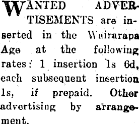 WANTED ADVERTISEMENTS are inserted in the Wiiiiarapa Age at the following ratesl insertion Is 6d, each subsequent ineertion Is, if prepaid. Other advertising by arrangement.