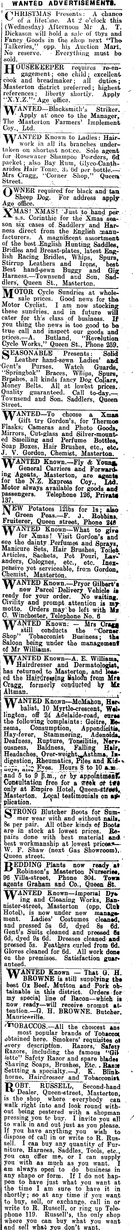 WANTED ADVERTISEMENTS. /CHRISTMAS Presents : A clianco of ft lifec'me. At 2 o'clock this (Wednesday) Afternoon Mr A. T. Dickason will hold a sale of t'oys and Fancy Goods ill the shop next "Th» Talkeries," opp. liis Auction Mart. No reserve. 'Everything must bo ■sold. : ■ XT OUSEKEEPER requires re-en-AJ - gagement; one child; excellent cook and breadmaker; all duties; Masterton district preferred; highest references; liberty shortly. Apply "X.Y.Z."^Age ; offico. TJIT"ANTED —Blacksmith's Striker. , "* Apply at* once to the Manager, The -Masterton Farmers' Implement Coy., Ltd. , "Vl/"ANTED Known to Ladies: Hair- * work in all its branches undertaken on shortest notice. Sole agent for Hose water Shampoo Powders, 6d packet; also Bay Rum, Glyco-Canth-arides Hair Tonic. 6d per bottle.— Mrs Cragg, "Corner -Shop," Queen Street. » WNER required for black and tail. Sheep Dog. For address apply" Age office. , . , V"MAS! XMASI "Just to hand J>eir s.s. Corinthic for the XmaS season six eases of . Saddlery and Harness direct from the English manufacturers. A magnificent assortment of the best English Hunting Saddles, Bridles and Breast-plates, latest English Racing Bridles, Wnips, Spurs, Stirrup Leathers and Irons, best Best hand-pewn Buggy "and Gig Harness.—Townsend and Son, Saddlers', Queen St., Masterton. "Ji/TOTOR Cycle Sundries at wholesale prices. Good news for tha Motor Cyclist. I am now stocking these sundries, and in future will cater for thr's class of business. If you thing the news is too good to bo true call and inspect our goods and prices.—A. Butland, "Revolution Cycle Works," Queen St., Phone 269. REASONABLE Presents: Solid Leather hand-sewn Ladies' and Gent's Purses, Watch Guards, "Springbok" Braces, Wliips, Spurs, Brjushes, all kinds fancy Dog Collars, Money Belts. All at lowest prices. Quality guaranteed. Call to-day.— : Townsend and Son, Saddlers, Queen Street. TX^ANTED —To choose a Xmas " Gift try Gordon's, for Thermos Flasks;- Cameras and Photo Goods* Mirrors, Cut-glass and Silver-mount-ed Smelling and Perfume Bottles, Soap Boxes, Hair Brushes, etc., etcJ. V. Gordon, Chemist, Masterton. ANTED Known.—Fly & Young* General Carriers and Forwarding Agents,- Masterton, are agents for the N.Z. Express Coy., Ltd. Motor always available for goods and passengers. Telephone 126, Private 187. IV"EW Potatoes 121bs for Is; also Green Peas.—F. d. Bobbins, Fruiterer, Queen street, Phone 24fl \M7"ANTED Known—What to give TT for Xmas! Visit Gordon's and see the dainty Perfumes and Sprayß, Manicure Sets, Hair Brushes, Toilet Articles, Sachets, Pot Pouri, Lav-* anders, Colognes, etc., etc. Inexpensive yet serviceable, from Gordon. Chemist, Masterton. TXT"ANTED Known.—Pryor Gilbert's new Parcel' Delivery Vehicle is ready for your order. No waiting. Civility ana prompt, attention is my-: motto. Orders may" be left -with Ma C. Winchester, Telephone No. 6 ANTED Known: Mrs CrsM * still conducts the "Corner. Shop" Tobacconist Business; the Saloon being under the management of Mr Williams. T/yANTED Known—A. E. Williams, * " Hairdresser and Dermatologist, has returned to Masterton, and lowed the H&irdreiping Salem* from Mr« Cragg, formerly conducted by M* Altman. j - ANTED Known—MoMahon, H*r> * * balist, 10 Myrtle-crescent, lington, off 24 Ad'elaide-road, curst the following 'complaints: Goitre, Be* zema, Consumption, Appendicitis, Hay-fever, Stammering, Adenoids, Deafness, Rupture, Tonsilitis, Nervousness, Baldness, Falling Hair, Headaches, - ndigestion, Rheumatics, Piles and Kid- v uiji, iwC.Ejes*. Honrs 8 to 10 ».m.. and 5 to 9 p.m., "of by appofflifflialJ Con«ultati<m free for a ffflek dt t#i only at Empire Hotel, Queen-sif#«*4, Masterton. Local testimonials on »#» plication. •* CJTRONG Blutcher Boots for Suinmer wear with and without nails* 8s per pair. All other kinds of Boots are in stock at lowest prices. Repairs done with best material and best workmanship at lowest prices*— W. F. Shaw (next Gas Showroom),, Queen street: • TJEDDING Plants now ready •# w Robinson's Masterton Nurseries, 96 .Villa-street, Phone 804. Toir» agents Graham and Co., Queen St. "MTANTED Known—imperial Dy* * * ing and Cleaning Works, Ban-nister-street, Masterton (opp. Cluk Hotel), is now under new management. Ladies' Costumes clean #d, and pressed 5s 6d, dyed 8s fid. Gent's Suits cleaned and pressed 6s 6d, dyed 9s 6d . Dresses cleaned' and pressed ss. Feathers curled from 6d. Gloves cleaned for 6d. All work dan* on the premises. Satisfaction guaranteed. WANTED Known That G. H. "" BROWNE is still supplying tb® best Ox Beef. Mutton and Pork obr tainable in this district. Orders for my special line of Bacon—which is now . ready—will receive nromnt attention.—G. H. BROWNE. Butcher. Mauripftville. Tobaccos.—ah the choicest ana most popular brands of Tobacco* obtained here. Smokers' requisites ol <>very description. Razors,' Safety Razors, including the famous "Gif iettc" Safety Razor and spare blades shaving Soaps, Brushes, Etc.. Razoo Settting a specialty.—J. K. Blink. home, Hairdresser and Tobacconiit 1) OBT. RUSSELL, Second-hand Dealer, Queen-street, Masterton, is the shop where everybody can walk right into and look round without being pestered with a shopman pressing you to buy. I invite you all to walk in and out just as you please. If you have anything you wish to dispose of call in or write to R. Russell. I can buy any quantity of Furniture, Harness, Saddles, Tools, etc., you can offer mo, or I can supply you with as much as you want. I am always open to do business in any shape or form. If Ido not happen to nave just what you want at the time I am sure to have it in shortly; so at any time if you want to buy, sell, or exchange, call in or write to R. Russell, or ring up Telephone 119. Russell's, the only shop where you can buy what you want and sell whafc you don't want.