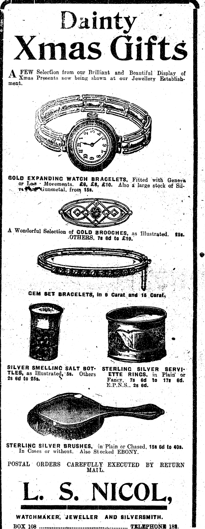 A FEW Selection from our Brilliant and Beautiful' Display o! Xmas Presents now being shown at our Jewellery Establishment. «a*«SSD wr y SOLD EXPANDING WATCH BRACELETS, Fitted with Geneva or if 6 * ' Movements. £B, £B, £lO. Also a large stock ofSil- >» fronj ISB. , , T A Wonderful Selection of COLD BROOCHES, as Illustrated. S6i. OTHERS. 7# 6d to £l9. GEM -SET?, bracelets, to 8 Carat and 15 Caraf* £. JL R JELLING BALT bot- sterling silver serviTLES, as Illustrated, 68. Others ETTE RINGS, in Plain* or 2s 6d to 255. > Fancy, 7s 6d to 178 6d» E.P.N.S., 2s 6d. RtIMWI STERLING SILVER BRUSHES, in' Plain or Chased, 158 6d to 408. In Gases or without. Also St Ocked EBONY. POSTAL ORDERS CAREFULLY EXECUTED BY RETURN MAIL. L. S. NICOL, WATCHMAKER; JEWELLER AND BILVERSMITH. BOX 108 TXLBPHONI 188.
