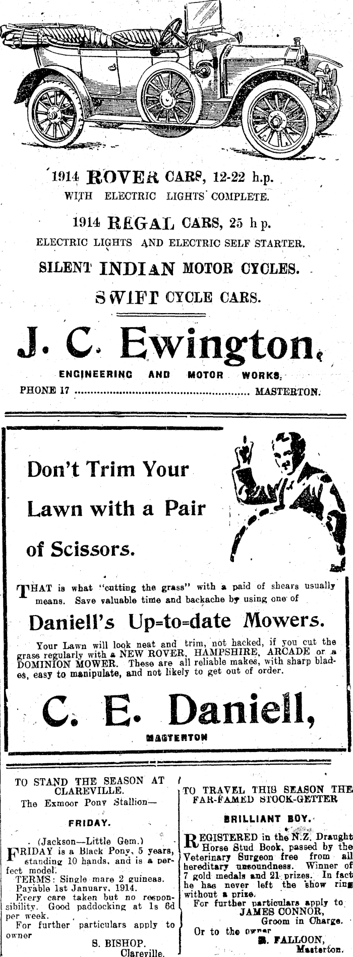 'mi ROVER CARP, 12-22 h.p. WI,TH ELECTRIC LIGHTS'COMPLETE. 1914 REGAL CABS, 25 hp. ELECTRIC LIGHTS AND ELECTRIC SELF STARTER. SILENT INDIAN MOTOR CYCLES. S vVIET CYCLE CARS. J. c ENGINEERING AND MOTOR WORKS. PHONE 17 MASTERTON. 0U n * ( Don't Trim Your Lawn with a Pair of Scissors. rriHAT is what "cutting the grass" with a paid of shears usually means. Save valuable time and backache by using one - of Daniell's Up=to=date Mowers. Your Lawn will look neat and' trim,, not hacked, jf you cu.t the grass regularly with a NEW ROVER, HAMPSHIRE, ARCADE or * DOMINION MOWER. These are all reliable makes, with sharp blades, easy to manipulate, and not likely to get out of order. Ci E. Diuii©ll« MASTERTON TO STAND THE SEASON AT CLAREVILLE. The Exmoor Pony Stallion— FRIDAY. . (Jackson —Little Gem.) , * ICjIRIDAY is a Black Pony, 5 years, etandine 10 hands, and is a perfect model'. TERMS: Single mare 2 guineas. Payable Ist January, 1914. Every care taken but no responsibility. Good paddocking at Is 6d per week. For further particulars apply to owner S. BISHOP. Clareville. TO TRAVEL THIS SEASON THE FAtt-FAMED ttTOOK-GKTTER BRILLIANT BOY. T> EGISTERED in the N.Z. Draught Horse Stud Book, passed by the Veterinary Surgeon free from all hereditary unsoundness. Winner of 7 gold medals and 21; prizes. In fact he has never left the 'show ring without a prize. For further particulars apply to JAMES CONNOR, Groom in Charge. ■ Or to the ow*«r B. FALLOON, I - Maiterton.