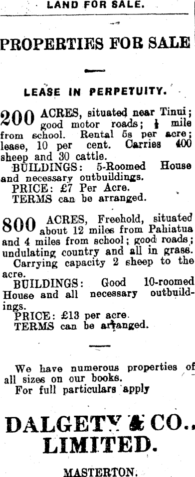 LAND FOR SALE. PROPERTIES FOR SALE LEASE IN PERPETUITY. OA A ACRES, situated near Tinui; good motor roads; i mile from school. Rental 6s per acre; lease, 10 per cent. Carries 400 sheep and 30 cattle. BUILDINGS: 5-Roomed House and necessary outbuildings. PRICE: £7 Per Acre. TERMS can be arranged. OA A ACRES, Freehold, situated OUU al)01lt 12 miles from Pahiatua and 4 miles from school; good roads; undulating country and all in grass. Carrying capacity 2 sheep to the acre. BUILDINGS: Good 10-roomed House and all necessary outbuildings. PRICE: £l3 per acre. TERMS can be arranged. We have numerous properties of all sizes on our books. For full particulars apply DALGETY M CO.. LIMITED. MASTERTON.