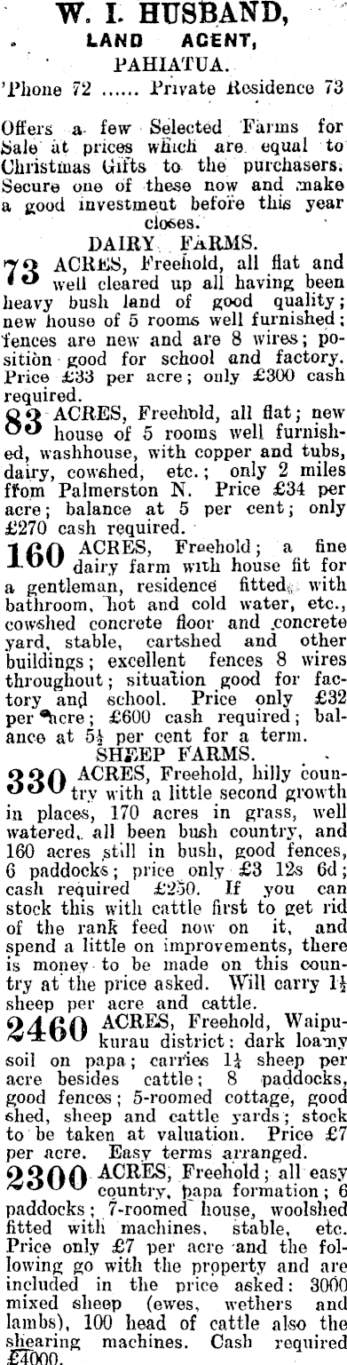 W. I. HUSBAND, LAND ACENT, PAHIATUA. 'Phone 72 Private Residence 73 Offers a- few Selected Farias for Sale at prices which are. equal to Christinas Gifts to the purchasers; Secure one of these cow and .make a good investment before this year closes. DAIRY FARMS. Q ACHES, Freehold, all flat and • " well cleared up all having been heavy bush land of good quality; new house of 5 rooms well furnished; ■fences are new and are 8 wires; position good for school and factory. Price £33 per acre; only £3OO cash required. 00 ACRES, Freehold, all flat; new house of 5 rooms well furnished, washhouse, with copper and tubs, dairy, cowshed, etc.; only 2 miles ffom Palmerston N. Price £34 per acre; balance at 5 per cent; only £270 cash required. LAO Freehold; a fine J-"" dairy farm with house fit for a gentleman, residence fitted;:; with bathroom, hot and cold water, etc., cowshed concrete floor and .concrete yard, stable, cartshed and other buildings; excellent fences 8 wires throughout; situation good for factory and school. Price only £32 per ; £6OO cash required ; balance at 5£ per cent for a term. SHEEP FARMS. . - O OA ACRES, Freehold, hilly counOOvJ try with a little second growth in places, 170 acres in grass, well watered,, all been bush country, and 160 acres .still in bush, good fences, 6 paddocks; price only £3 12s 6d; cash required £'2so. If you can stock this with cattle first to get rid of the rank feed now on it, and spend a little on improvements, there is money to be made on this country at the price asked. Will carry If sheep per acre and cattle. OJ. A A ACRES, Freehold, Waipukurau district: dark loamy soil on papa; carries 1£ sheep per acre besides cattle; 8 paddocks, good fences; 5-roomed cottage, good shed, sheep and cattle yards; stock to be taken at valuation. Price £7 per acre. Easy terms arranged. OQAA ACRES, Freehold; all easy C q U ntry, formation; 6 paddocks; 7-roomecl house, woolshed fitted with machines, stable, etc. Price only £7 per acre and the following go with the property and are included in the price asked: 3CK)O mixed sheep (ewes, wethers and lambs), 100 head of cattle also the shearing machines. Cash required £Tooo.