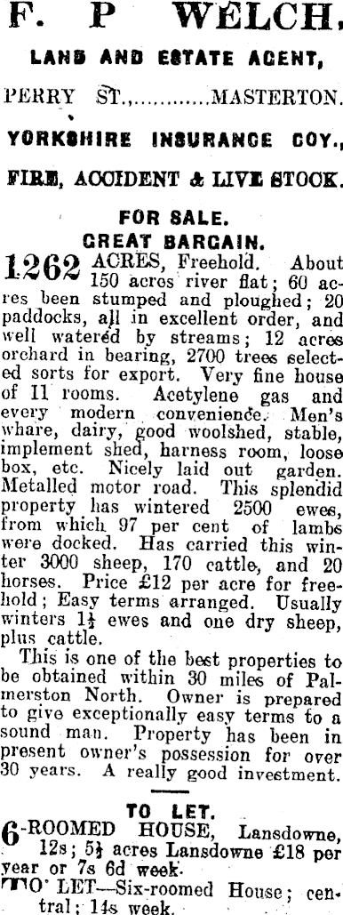 P. P WJELCH. LANS AND ESTATE AGENT, PEKRY Sl\, ...MASTERTON. % YORKSHIRE INSURANCE COY., FIBS, ACCIDENT A LIVE STOCK. FOR SALE. GREAT BARGAIN. I OftO ACRES, Freehold. About 150 acres river flat; 60 acres been stumped and ploughed; 20 paddocks, ajl in excellent order, and well watered by streams; 12 acres orchard in bearing, 2700 trees selected sorts for export. Very fine house of II rooms. Acetylene gas and every modern conveniende.; Men's whare, dairy, good woolshed, stable, implement shed, harness room, loose box, etc. Nicely laid out garden. Metalled motor road. This splendid property lias wintered 2500 ewes, from which 97 per cent of lambs were docked. Has carried this winter 3000 sheep, 170 cattle, and 20 horses. Price £l2 per acre for freehold ; Easy terms arranged. Usually winters l| ewes and one dry sheep, plus cattle. This is one of the beet properties to be obtained within 30 miles of Palmerston North. Owner is prepared to give exceptionally easy terms to a sound man. Property has been in present owner's possession for over 30 years. A really good investment. 0-ROOMED HOUSE, Lansdowne, 12s; 5J acres Lansdowne £lB per year or 7s 6d weeknriO' LET—Six-roomed House: central ; 14-s week.
