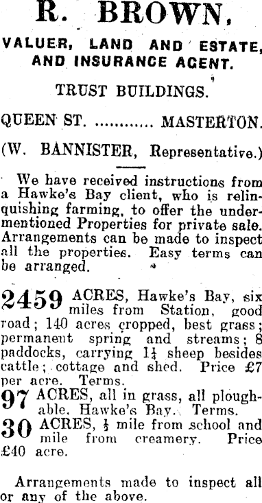 R. BROWN. VALUER, LAND AND ESTATE, AND INSURANCE AGENT. TRUST BUILDINGS.' QUEEN ST MASTERfON. (W. BANNISTER, Representative.) We have received instructions from a Hawke's Bay client, who is relinquishing farming, to offer the undermentioned Properties for private sale. Arrangements can be made to inspect •ill the properties. Easy terms can be arranged. * OJ.KQ ACRES, Hawke's Bay, six miles from Station, good road; 140 acres cropped, best graes; permanent spring and streams; 8 paddocks, carrying sheep besides cattle; cottage and shed. Price £7 per acre. Terms. ACRES, all in grass, all ploughable. Hawke's Bay., Terms. OA ACRES, | mile from school and mile from creamery. Price £4O acre. Arrangements made to inspect all or any of the above.