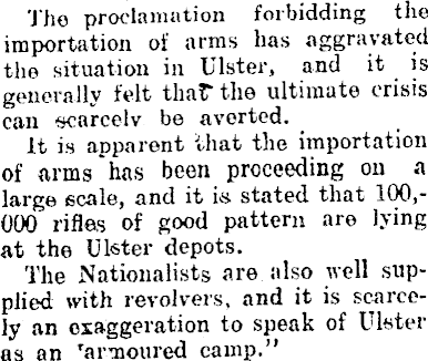 Tho proclamation forbidding the importation of arms has aggravated the situation in Ulster, and it is generally felt thafr the ultimate crisis can (scarcely be averted. It is apparent that the importation of arms has been proceeding on a large scale, and it is stated that 100,000 rifles of good pattern are lying at the Ulster depots. The Nationalists are also well supplied with revolvers, and it is scarcely an exaggeration to speak of Ulster as an 'armoured camp."