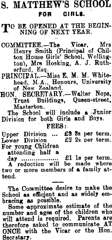 S. MATTHEW'S SCHOOL FOR GIRLS. TO BE OPENED AT THE BEGINNING OF NEXT YEAR. COMMITTEE.—Tie Vicar, Mrs Henry Smith (Principal of Chilton House Girls' School, Wellington), Mrs Hosking, A. J. Rutherford, Esq. PRINCIPAL.—Miss E. M. M. Whitehead, M.A., Honours, University of New Zealand. HON. SECRETARY.—WaIter Nops, Truet Buildings, Queen-street, Masterton. # The School will include a Junior Division for both Girls and Boys. FEES:Upper Division ... £3 8s per term. Lower Division £2 2s per term. For young Children attending half a day v . £1 Is P»r term. A reduction will be made where two or more members of a family attend. The Committee desire to make the School as elßcjent and aB widely embracing as possible. Some "approximate estimate of the number and ages of the children who will attend is required. Parents are therefore asked to communicate AT ONCE with the Vicar or the Hon. Secrstary.