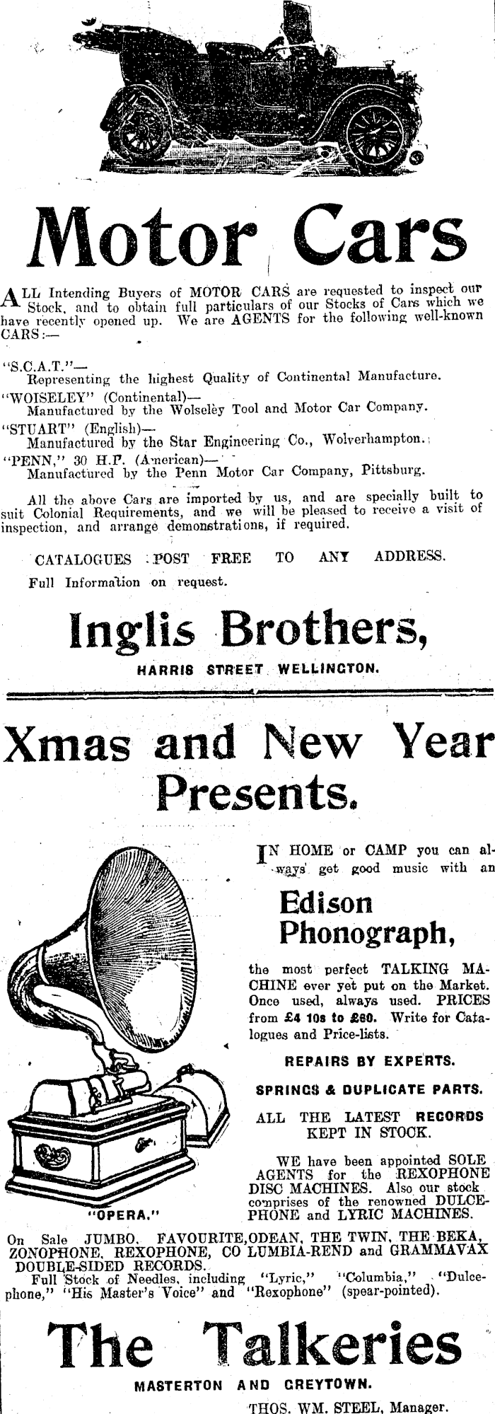 M Bilms|sS@i*s r® Motor Cars ALL * C+ / uu Intending Buyers of MOTOR CARS are requested to inspect our Stock, and to obtain full particulars of our Stocks of Cars which we have recently opened up. We are AGENTS for the following; well-known CARS "S C A.T " Representing the highest Quality of Continental Manufacture. "WOISELEY" (Continental)— , , Manufactured by the Wolseley Tool and Motor Car Company. "STUART" (English)— / . ' Manufactured by the Star Engineering Co., Wolverhampton. ; "PENN," 30 H.P. (American)—' " Manufactured by the Penn Motor Car Company, Pittsburg. All the above Cars are imported by us, and are specially built to suit Colonial Requirements, and we will be pleased to receive a visit ot inspection, and arrange demonstrations, if required. CATALOGUES : POST FREE TO ANY ADDRESS. Full Information on request. Inglls Brothers, HARRIB STREET WELLINGTON. Xmas and New Year SsS m JN HOME or CAMP you can al- ' get good music with an Edison Phonograph, the moat perfect TALKING MACHINE ever yet put on the Market. Once used, always used. PRICES from £4 108 to £6O. Write for Catalogues and Price-lists. REPAIRS BY EXPERTS. SPRINGS & DUPLICATE PARTS. ALL THE LATEST RECORDS KEPT IN STOCK. WE have been appointed SOLE AGENTS for the REXOPHONE DISC MACHINES. Also our stock comprises of the renowned DULCEPHONE and LYRIC MACHINES. On Sale JUMBO. FAVOURITE,ODEAN, THE TWIN, THE BEKA, ZONOPHONE, REXOPHONE, CO LUMBIA-REND and GRAMMAVAX DOUBLE-SIDED RECORDS. Full 'Stock of Needles, including "Lyric," ''Columbia, - "Dulcephone," "His Master's Voice" and "Rexophone" (spear-pointed). The Talkeries MABTERTON AND GREYTOWN. THOS. WM. STEEL, Manager. OPERA.'