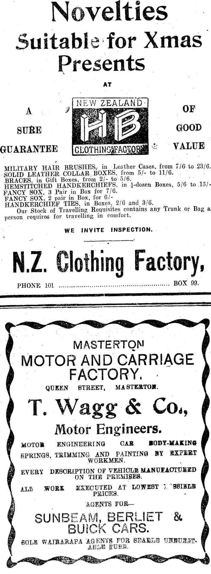 Novelties Suitable for Xmas Presents AT A SUftE GUARANTEE ZEALAND NT' W CLO.THINGIFAGiQ OF GOOD VALUE MILITARY HAIR BRUSHES.; in Leather Cases, from 7/6 to 23/6. SOLID LEATHER COLLAR, BOXES, from 5/- to 11/6. BRACES iii Gift Boxes, from 2/- to 5/6. HEMSTITCHED HANDKERCHIEFS, in J-dozen Boxes, 5/6 to .15/FANCY SOX, 3 Pair in Box for 7/6. FANCY SOX, 2 pair in Box, for 6/HANDKERCHIEF TIES, in Boxes, 2/6 and 3/6. Our Stock of Travelling Requisites contains any Trunk or Bag a person requires for travelling in comfort. WE INVITE INSPECTION. N.Z. Clothing Factory, PHONE 101 BOX "• MASTERTON MOTOR AND CARRIAGE FACTORY. QUEEN STREET, MA STREW*. T. Wagg & Co«, Motor Engineers. MOTOR ENGINEERING CAE BODY-MAKING SPRINGS, TRIMMING AND PAINTIN9 BY BXFIET WORKMEN. EVERY DESCRIPTION OF VEHICLE MANUEAOTUSJED ON THE PREMISES. |T,IN WORK EXECUTED AT LOWEST PSICES. AGENTS FOR—SUNBEAM, BERLIET & BUICK CARS. SOLE WAI&AJ&APA 'AGENTS FOR SBABL3 UMIUUTABLE SI'U B®.