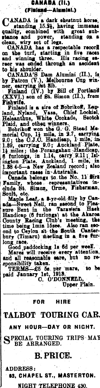 CANADA (II.) (Fl»[»i—AliwHiil.) ■ & . ■■ ' ■' •. CANADA is a dark ehesthut horse, u standing 15.81, having unmans* quality, wmbined with great aubstence and power, standing on ■ clean, wiry set of legs. CANADA has a respectable reoorß on the turf, starting in five raots and winning three. Hii racing career was ended through an asoident to Mi fliouldar. CANADA'S Dam Alumini (II.), it. by Patron (V.), Melbourne Cap win. (XXVI.) son of St. Simon (II.), from Fishwife. Finland is a air* of. Bobrikof, Lapland, Nyland, .Vasa, Chief Loohial, Plaid, and otha* winnerß., Bobrikof won the a.' G. Stead Me morial Cup, U mile, in 5.7, earrying 9.0: the 0.J.0. BJandiaap, 1 mile, in* H miles; the -Porangahau 6 furlongi, in 1.14, carry .9.lls"lslington Plata. Auckland, 1 mile, in 1.88 4-s—a New Zealand record; also important raaai in-Australia. Family, whose, representatiTee indude St. Simon, Orme, Fisherman, Soult, eto. ;, • . ' . Maple Leaf, a i-jr-old ,nlly by Canada—Sweet Nell, ran aetond to Pleasure Bent in the Tarawera Hack Handicap (6 furlongs) at the Akaroa County Racing Club's meeting, the time being lmin ISsee. Also ran second to Ceylon at the South Canterbury (Timaru) meeting, in a 8?e foxlong.raise. "•'■■ ■ .'.''-■..■>. ,r ■ ■•". • Good padddeking Is Bd per wee*. . Mares wiU receive erery attention, and all re*9oiiabls tire, but no re* eponsibility taken. , TERMS—£S 6a. per mare, to he paid January Ist, 1918. - 0. O'DONNHLL, Upper Plain. FOR HIRE TALBOT TOURING CAR. ANY HOUR—DAY OR NIGHT; BE ARRANGED. B. PRICE. ADDRESS: IS, CHAPEL ST., MASTER-TON. NIGHT TELEPHONE 430.
