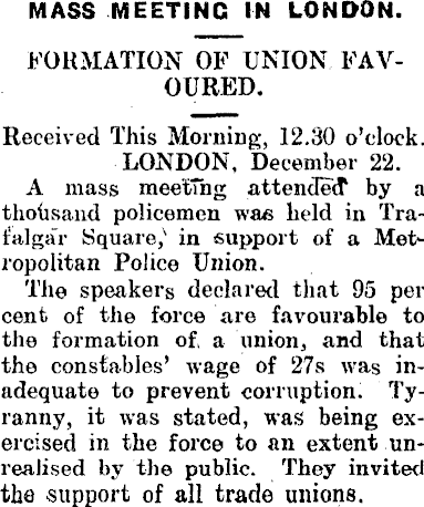 MASS MEETING IN LONDON. FORMATION OF UNION FAVOURED. Received This Morning, 12.30 o'clock. LONDON, December 22. A mass meeting attended' by a thousand policemen wae held in Trafalgar Square, 11 in support of a Metropolitan Police Union. The speakers declared that 95 per cent of the force are favourable to the formation of, a union, and that the constables' wage of 27s was inadequate to prevent corruption. Tyranny, it was stated, was being exercised in the force to an extent unrealised by the public. They invited the support of all trade unions.