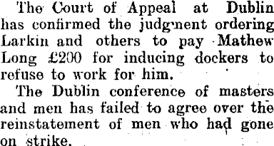 The Court of Appeal at Dublin has confirmed the judgment ordering Larkin and others to pay Mathew Long £2OO for inducing dockers to refuse to work for him. ' The Dublin conference of masters and men has failed to agree over the reinstatement of men who had gone on strike.