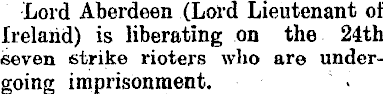 Lord Aberdeen (Lord Lieutenant of Ireland) is liberating on the 24th seven strike rioters who are undergoing imprisonment.