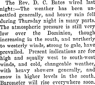 The Rev. D. C. Bates wired Inst night:—The weather has been unsettled generally, and heavy rain fell during Thursday night in many parts. The atmospheric pressure is still very low over the Dominion, though increasing in the south, and northerly to westerly winds, strong to gale, have prevailed. Present indications are for high and squally west to south-west winds, and cold, changeable weather, with heavy showers generally, and snow in higher levels in the (south. Barometer will rise everywhero soon.