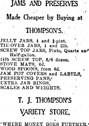 JAMS AND PRESERVES Made Cheaper by Buying at THOMPSON’S. JELLY JARS, 4 and t-pint. TIE-OVER JARS, 1 and 21b. SCREW TOP JARS, Pinto, Quarts an’ 1 Half-gallon. I Jib SCREW TOP, 6/6 dozen. STOVE MATS, 6d. WOOD SPOONS, from 6d. JAM POT COVERS and LABELS, PRESERVING PANS, EXTRA JAB RINGS, SCALES AND "WEIGHTS. T. J. THOMPSON'S VARIETY STORE, 'WHERE MONEY GOES FURTHER.’