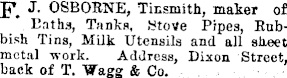 J?, J. OSBORNE, Tinsmith, maker of Baths, Tanks, Stove Pipes, Rubbish Tins, Milk Utensils and all sheet metal work. Address, Dixon Street, back of T. Wagg & Co.