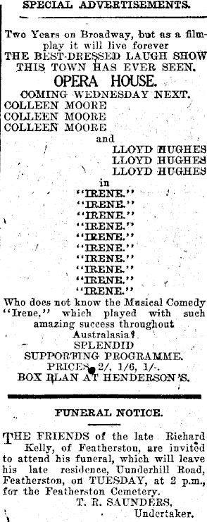 SPECIAL ADVERTISEMENTS. Two Years on Broadway, but as a filmplay it will live forever THE BEST-DRESSED LAUGH SHOW THIS TOWN HAS EVER SEEN. OPERA HOUSE. COMING WEDNESDAY NEXT. COLLEEN MOORE COLLEEN MOORE COLLEEN MOORE and LLOYD HUGHES LLOYD HUGHES LLOYD HUGHES in “IRENE.” “IRENE.” “IRENE.” “IRENE.” “IRENE.” “IRENE.” “IRENE.” “IRENE.” ‘ ’IRENE. ’ ’ “IRENE.” Who does not know the Musical Comedy “Irene,” which played with such amazing success throughout Australasia? SPLENDID SUPPORTING PROGRAMME. PRICEij-2/. 1/6, 1/-. BOX RLAN AT HENDERSON’S. FUNERAL NOTICE. JHE FRIENDS of the late Richard Kelly, of Featherston, are invited to attend his funeral, which will leave his late residence, Uunderhill Road, Featherston, on TUESDAY, at 2 p.m., for the Featherston Cemetery. T. R. SAUNDERS, Undertaker.