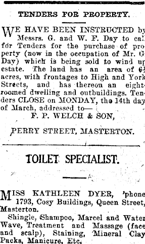 TENDERS FOR PROPERTY. WE HAVE BEEN INSTRUCTED by Messrs. G. and W. F. Day to call for Tenders for the purchase of property (now in the occupation of Mr. G. Day) which is being sold to wind up estate. The land has an area of 6) acres, with frontages to High and York Streets, and has thereon an eightroomed dwelling and outbuildings. Tenders CLOSE on MONDAY, the 14th day of March, addressed to— F. P. WELCH & SON, PERRY STREET, MASTERTON. TOILET SPECIALIST. MISS KATHLEEN DYER, ’phone 1793, Cosy Buildings, Queen Street, Masterton. Shingle, (Shampoo, Marcel and Water Wave, Treatment and Massage (face and scalp), Staining, Mineral Clay Packs, Manicure, Etc.