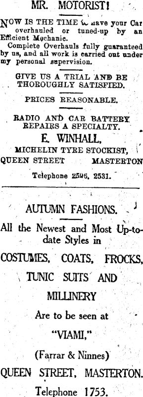 MR. MOTORIST! JJOW IS THE TIME nave your Car overhauled or tuned-up by an Efficient Mechanic. Complete Overhauls fully guaranteed by us, and all work is carried out under my personal supervision. GIVE US A TRIAL AND BE THOROUGHLY SATISFIED. PRICES REASONABLE. RADIO AND CAR BATTERY REPAIRS A SPECIALTY. E. WINHALL, MICHELIN TYRE STOCKIST, QUEEN STREET MASTERTON Telephone 2596. 2531. AUTUMN FASHIONS. j All the Newest and Most Up-to-date Styles in COSTUMES, COATS, FROCKS, TUNIC SUITS AND MILLINERY Are to be seen at “VIAMI,” (Farrar & Ninnes) QUEEN STREET, MASTERTON. Telephone 1753.