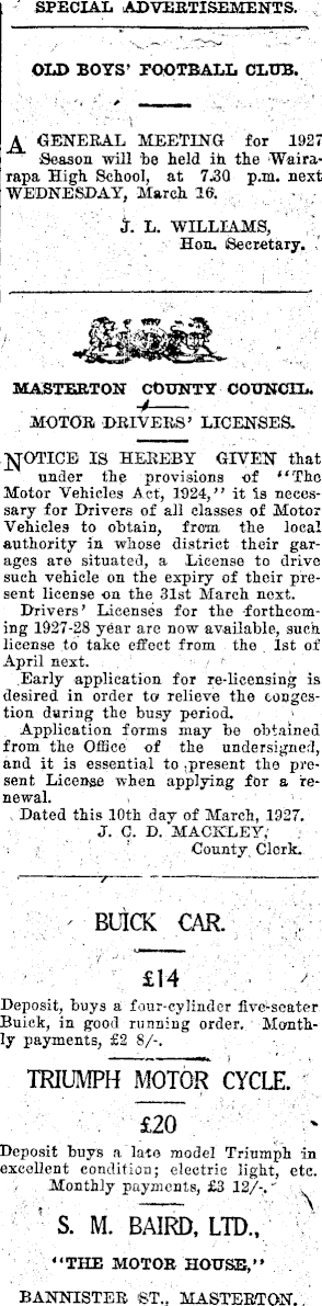 SPECIAL ADVERTISEMENTS. OLD BOYS’ FOOTBALL CLUB. \ GENERAL MEETING for 1927 Season will be held in the Wairarapa High School, at 7.30 p.m. next WEDNESDAY, March 16. J. L. WILLIAMS, Hon. Secretary. MASTERTON COUNTY COUNCIL. MOTOR DRIVERS’ LICENSES. NOTICE IS HEREBY GIVEN that under the provisions of “The Motor Vehicles Act, 1924,” it is necessary for Drivers of all classes of Motor Vehicles to obtain, from the local authority in whose district their garages are situated, a License to drive such vehicle on the expiry of their present license on the 31st March next. Drivers’ Licenses for the -forthcoming 1927-28 year are now available, such license to take effect from the Ist of April next. Early application for re-licensing is desired in order to relieve the congestion during the busy period. Application forms may be obtained from the Office of the undersigned, and it is essential to present the present License when applying for a renewal. Dated this 10th day of March, 1927. J. C. D. MACKLEY, County Clerk. BUICK CAR. £l4 Deposit, buys a four-cylinder five-seater Buick, in good running order. Monthly payments, £2 8/-. TRIUMPH MOTOR CYCLE. £2O Deposit buys a late model Triumph in excellent condition; electric light, etc. Monthly payments, £3 12/-. S. M. BAIRD, LTD., “THE MOTOR HOUSE,” BANNISTER ’ST., MASTERTON.