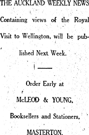 THE AUCKLAND WEEKLY NEWS Containing views of the Royal Visit to Wellington, will be published Next Week. Order Early at McLEOD & YOUNG, Booksellers and Stationers, MASTERTON.