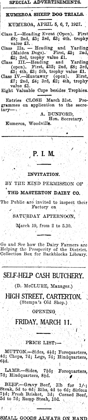 SPECIAL ADVERTISEMENTS. KUMEROA SHEEP DOG TRIALS. KUMEROA, APRIL 5,6, 7, 1927. Class I. —Heading Event (Open). First £8; 2nd, £5; 3rd, £3; 4th. trophy value £l. Class Ila. — Heading and Yarding (Maiden Dogs). First, £5; 2nd, £2; 3rd, trophy value £l. Class lll.—Heading and Yarding (open). First, £l5; 2nd, £8; 3rd, £5; 4th, £3; sth, trophy value £l. Class IV.—Huntaway (open). First, £7; 2nd, £4; 3rd, £2; 4th, trophy value £l. Eight Valuable Cups besides Trophies. Entries CLOSE March 31st. Programmes on application to the secretary— A. DUNFORD, Hon. Secretary. Kumeroa, Woodville. P. I. M. INVITATION. BY THE KIND PERMISSION OF THE MASTERTON DAIRY CO. The Public are invited to inspect their Factory on SATURDAY AFTERNOON, March 19, from 2 to 5.30. Go and See how the Dairy Farmers are Helping the Prosperity of the District. Collection Box for Backblocks Library. SELF-HELP CASH BUTCHERY. (D. McCLURE, Manager.) HIGH STREET, CARTERTON. (Stempa’s Old Shop.) OPENING FRIDAY, MARCH 11. i PRICE LIST:— MUTTON.—Sides, 44d; Forequarters, 4d; Chops, 7d; Legs, 7d; Hindquarters, 64d. LAMB.-—Sides, 7jd; Forequarters, 7d; Hindquarters, BJd. / BEISF.—-Gravy Beef, 31b for 1/-; Steak, 5d to 6d; Ribs, 4d to 6d; Sirloin 7|d; Fresh Brisket, 3d; Corned Beef, 5d to 7d; Rump Steak, lOd. SMALL GOODS ALWAYS ON HAND