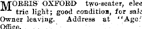 jjrORRIS OXFORD two-seater, eleetrie light; good condition, for sale. Owner leaving. Address at "Age” Office.