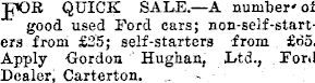 JpOR QUICK SALE.—A number- of good used Ford cars; non-self-start-ers from £25; self-starters from £65. Apply Gordon Hughan, Ltd., Ford Dealer, Carterton.